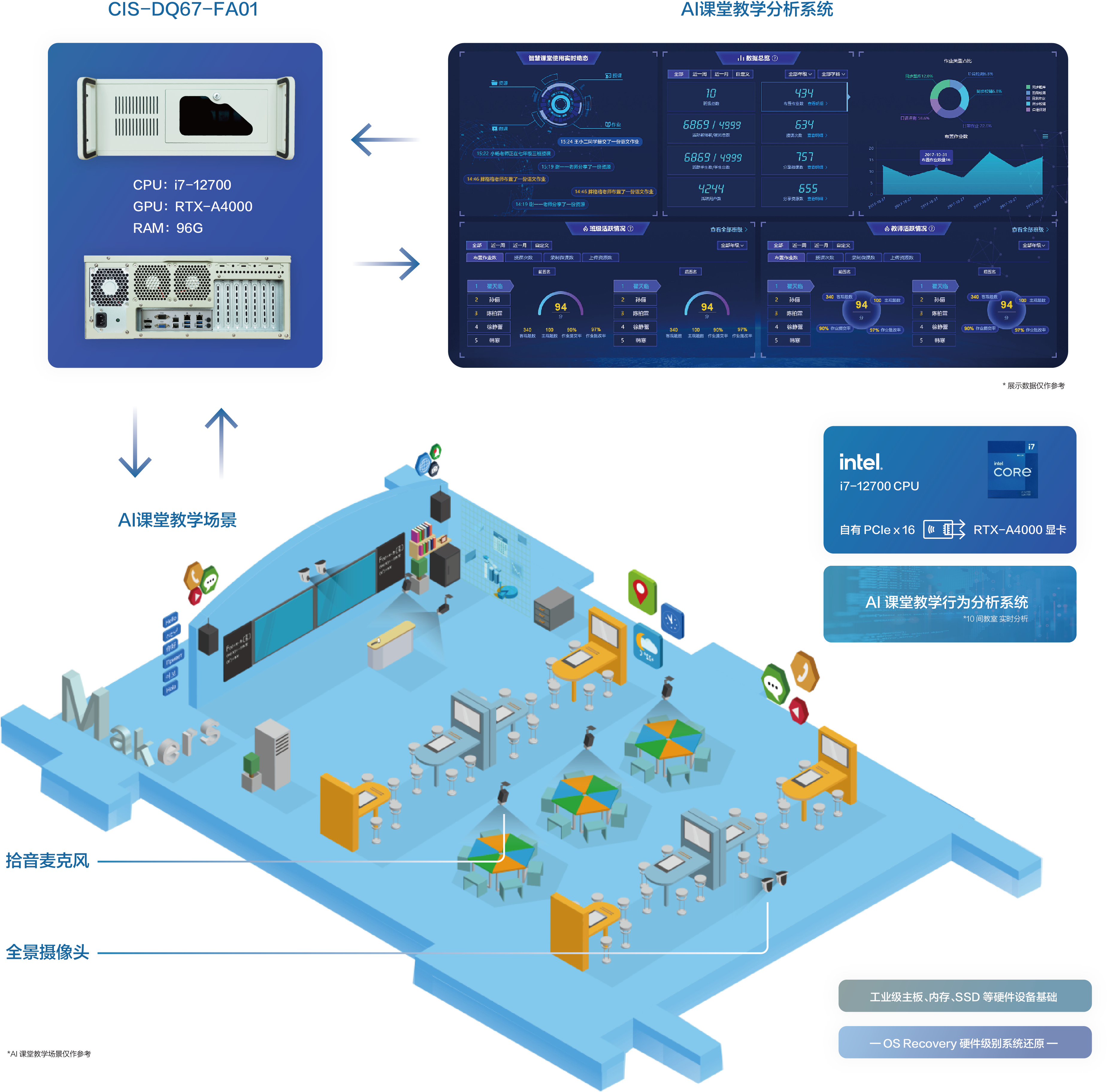 基于用户需求,九州酷游提供基于CIS-DQ67-FA01 4U箱体电脑为核心计算单元的AI课堂教学分析解决方案,该方案具备以下优势: